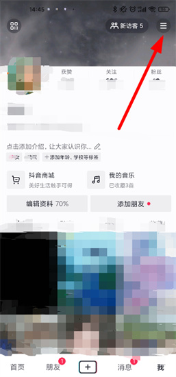 1、进入抖音app后,你可以看到右上角的三杠,点击它。